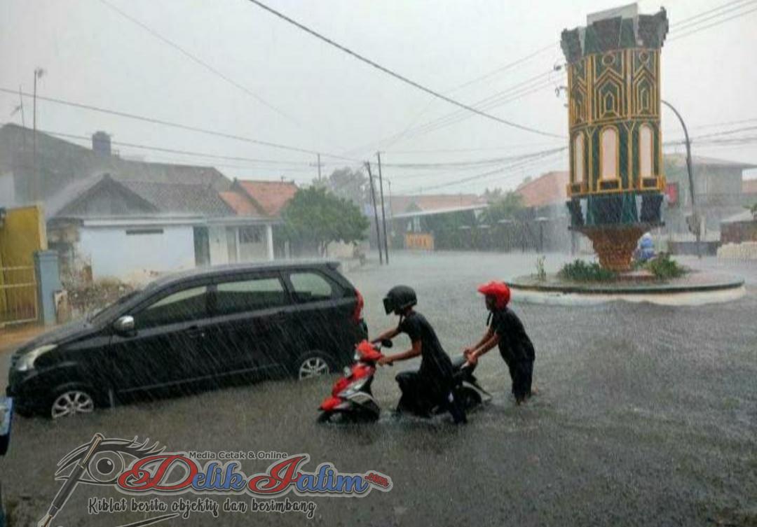 Bangkalan, Delikjatim.comHujan deras yang mengguyur kota Bangkalan menyebabkan sejumlah wilayah terendam banjir, Kamis sore (5-11-2020)