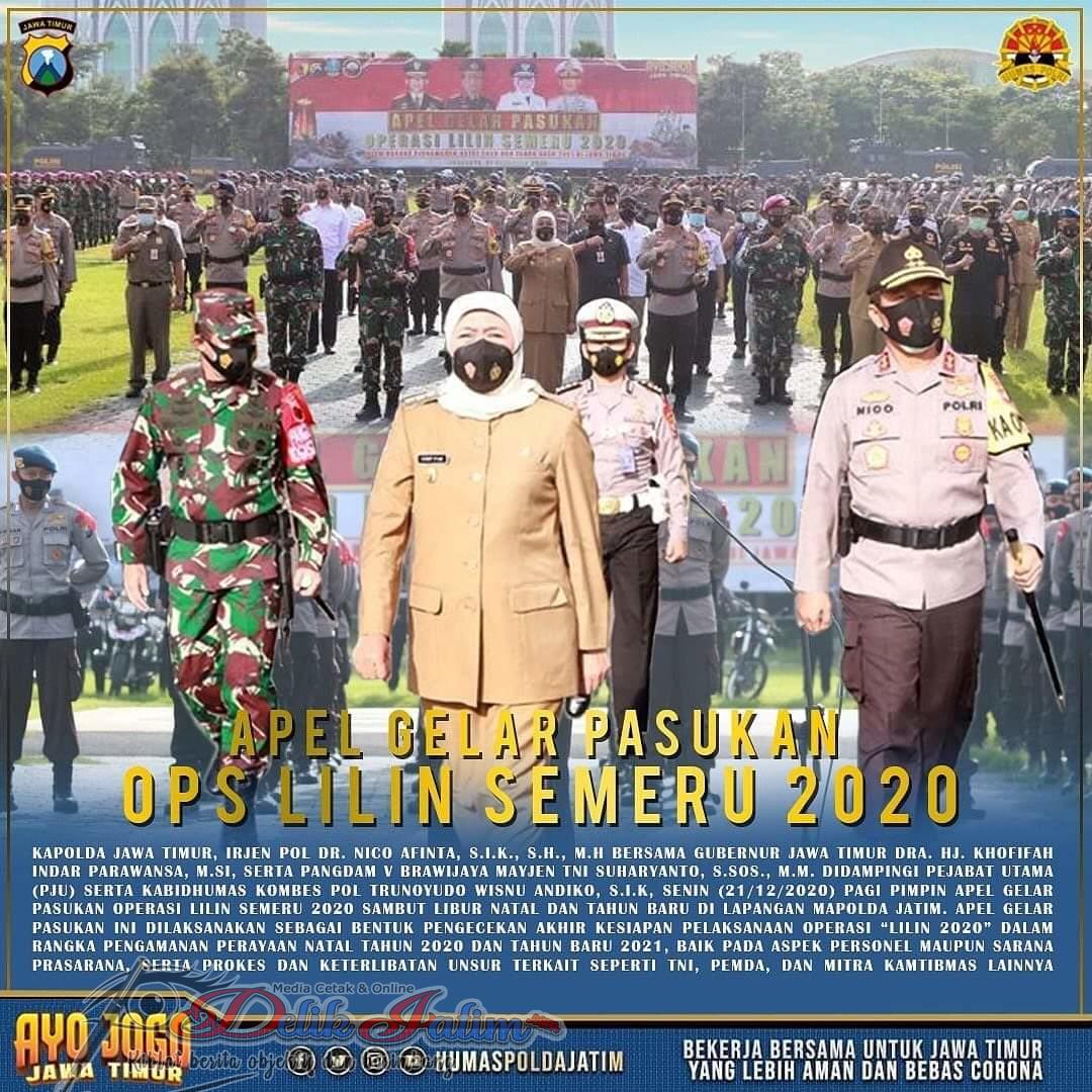Surabaya, Delikjatim.com – Gubernur Jatim Khofifah Indar Parawansa, Forkopimda Jawa Timur, Pangdam V Brawijaya Mayjen TNI Suharyanto dan Kapolda Jawa Timur Irjen Pol Dr. Nico Afinta, didampingi Pejabat Utama (PJU) Polda Jatim Senin (21/12/2020) pagi pimpin Apel Gelar Pasukan Operasi Lilin Semeru 2020 sambut libur Natal dan Tahun Baru di Lapangan Mapolda Jatim.