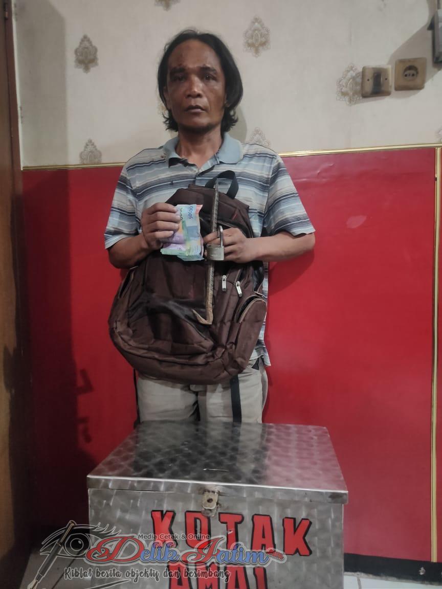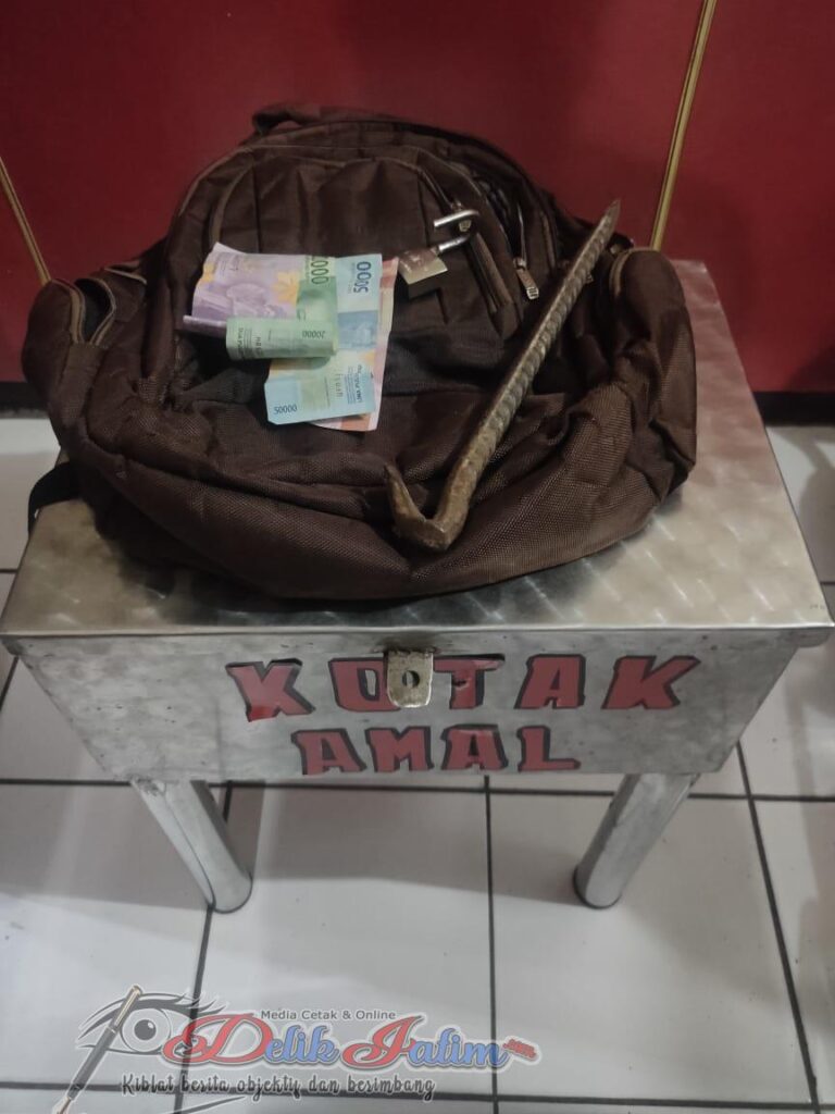 Polisi berhasil mengamankan barang bukti berupa 1 (Satu) Buah Tas Rangsel warna hitam, 1 (Satu) buah Linggis ukuran kurang lebih 40 Cm, 1 (Satu) Buah Gembo, 1 (Satu) Buah Kotak Amal yang terbuat dari besi stanlisteel dengan ukuran Panjang 40 Cm,Lebar 30 Cm, Tinggi 70 Cm dan Uang Tunai sebesar Rp.180.000,- (Seratus delapan puluh ribu rupiah).
