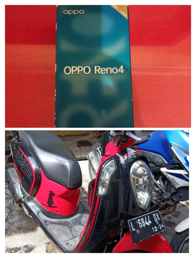 Adapun barang bukti yang berhasil diamankan 1 (satu) unit sepeda motor Jenis Honda Scoopy No.Pol L 6844 DX dan 1 (satu) buah Dis book HP Merk OPPO type Reno 4 warna Biru.