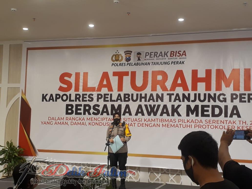 Kapolres Pelabuhan Tanjung Perak, AKBP Ganis Setyaningrum, S.Si., M.H. menyampaikan posisi dan peranan media massa sangat strategis dalam membangun rasa kesadaran dan pentingnya menjaga kondusifitas kamtibmas selama tahapan pilkada berlangsung.