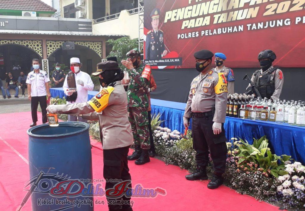 Kapolres Tanjung Perak AKBP Ganis Setyaningrum, mengatakan,”Adapun hari ini yang kita musnahkan adalah Barang bukti miras sebanyak 366 Botol atau setara dengan 600 Liter miras, hasil dari penangkapan & pengungkapan kasus di 71 TKP antara lain di Wilayah hukum Polres Pelabuhan Tanjung Perak yakni Polsek Krembangan, Polsek Asem Rowo, Polsek Pabean Cantikan, Polsek Semampir & Polsek Kenjeran”. Kata Ganis.