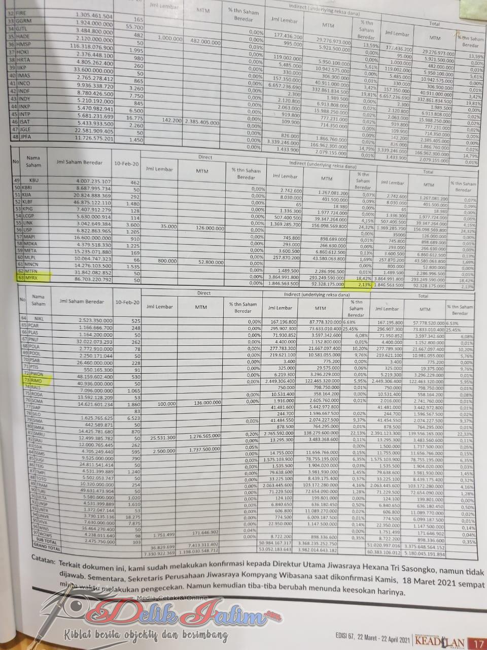 Sebagai bukti pendukng lain untuk memperjelas keterangan Fitnah Hexana Tri Sasongko terhadap Kliennya, Benny Tjokrosaputro, Fajar Gora, SH,MH membeberkan bukti daftar 124 nama perusahaan (emiten) yang dimiliki PT.Asuransi Jiwasraya atau Reksadana – reksadananya serta persentasi kepemilikan di masing – masing saham tersebut.