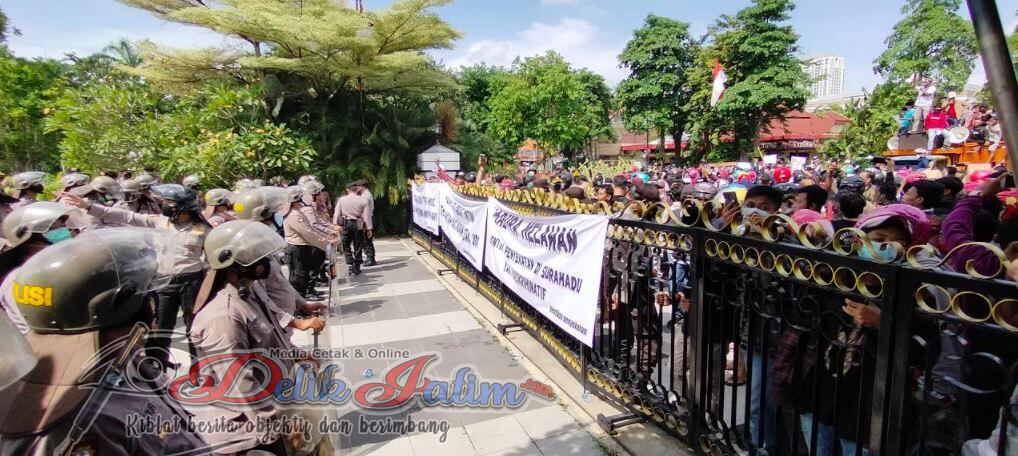 Surabaya, Delikjatim.com – Masyarakat Madura melakukan aksi demo ke balai Kota Surabaya untuk menyuarakan aspirasinya. Mereka menuntut penghapusan penyekatan di jembatan Suramadu, Senin (21/6/2021).