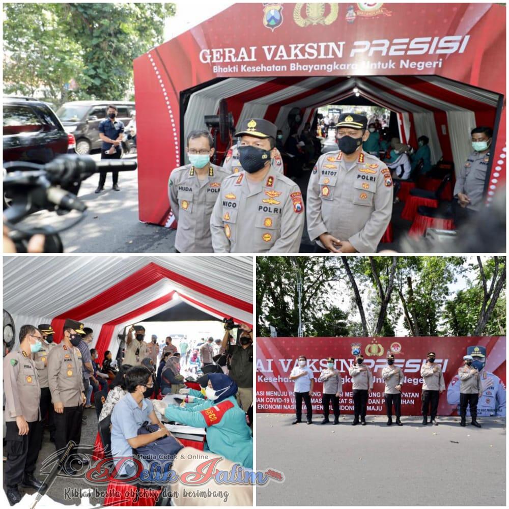 Surabaya, Delikjatim.com – Kapolda Jawa Timur Irjen Pol Nico Afinta bersama Pejabat Utama dan Kabid Humas Polda Jatim Kombes Pol Gatot Repli Handoko, melakukan peninjauan Gerai Vaksinasi Presisi, di Taman Bungkul, Surabaya, pada Rabu (30/6/2021), dalam rangka mendukung program pemerintah 1 juta vaksin perhari, untuk membentuk Herd Immunity.
