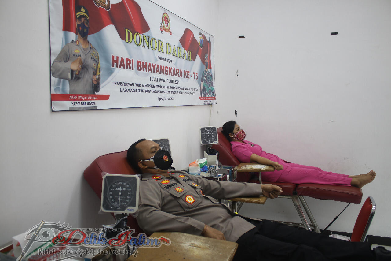 Ngawi, Delikjatim.com – Dalam rangka menyambut HUT Bhayangkara Ke- 75, Polres Ngawi bersama jajarannya menggelar bakti sosial donor darah, bertempat di Kantor PMI Ngawi, Kamis (24/6/2021).