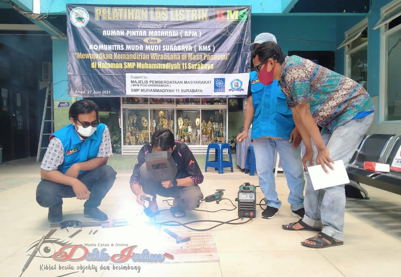 Surabaya, Delikjatim.com – Guna mewujudkan kemandirian wirausaha, terutama di masa pandemi Covid-19 yang berkepanjangan, Rumah Pintar Matahari (RPM PCM Krembangan Surabaya) kerja bareng Komunitas Muda-Mudi Surabaya (KMS) menggelar pelatihan las listrik secara gratis bertempat di halaman SMP Muhammadiyah 11 Surabaya, Ahad (27/06/2021).