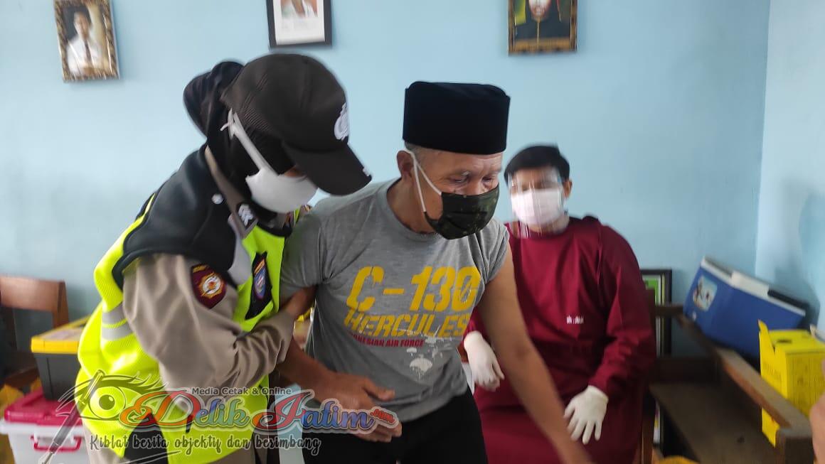Suwadi dengan tubuh rentanya dibantu berjalan perlahan bersama putranya serta anggota Bhabinkamtibmas Polsek Pakis, datang ke lokasi vaksinasi dengan penuh semangat.