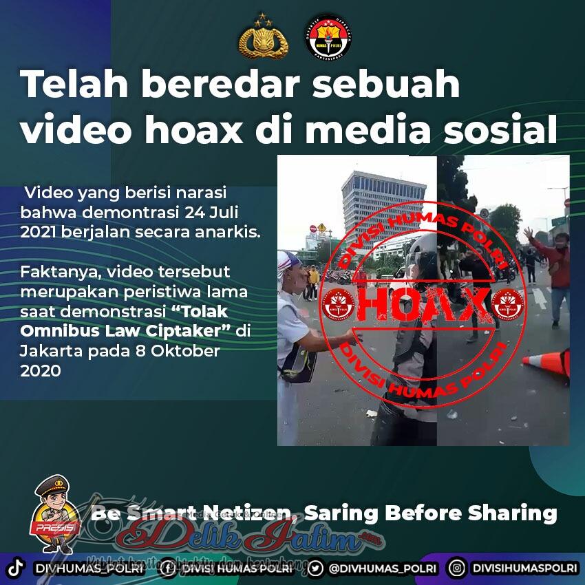 “Itu video hoaks. Faktanya adalah demonstrasi itu merupakan peristiwa lama saat demonstrasi tolak omnibus law ciptaker di Jakarta pada 8 Oktober 2020,” kata Argo kepada wartawan, Jakarta, Sabtu (24/7/2021).