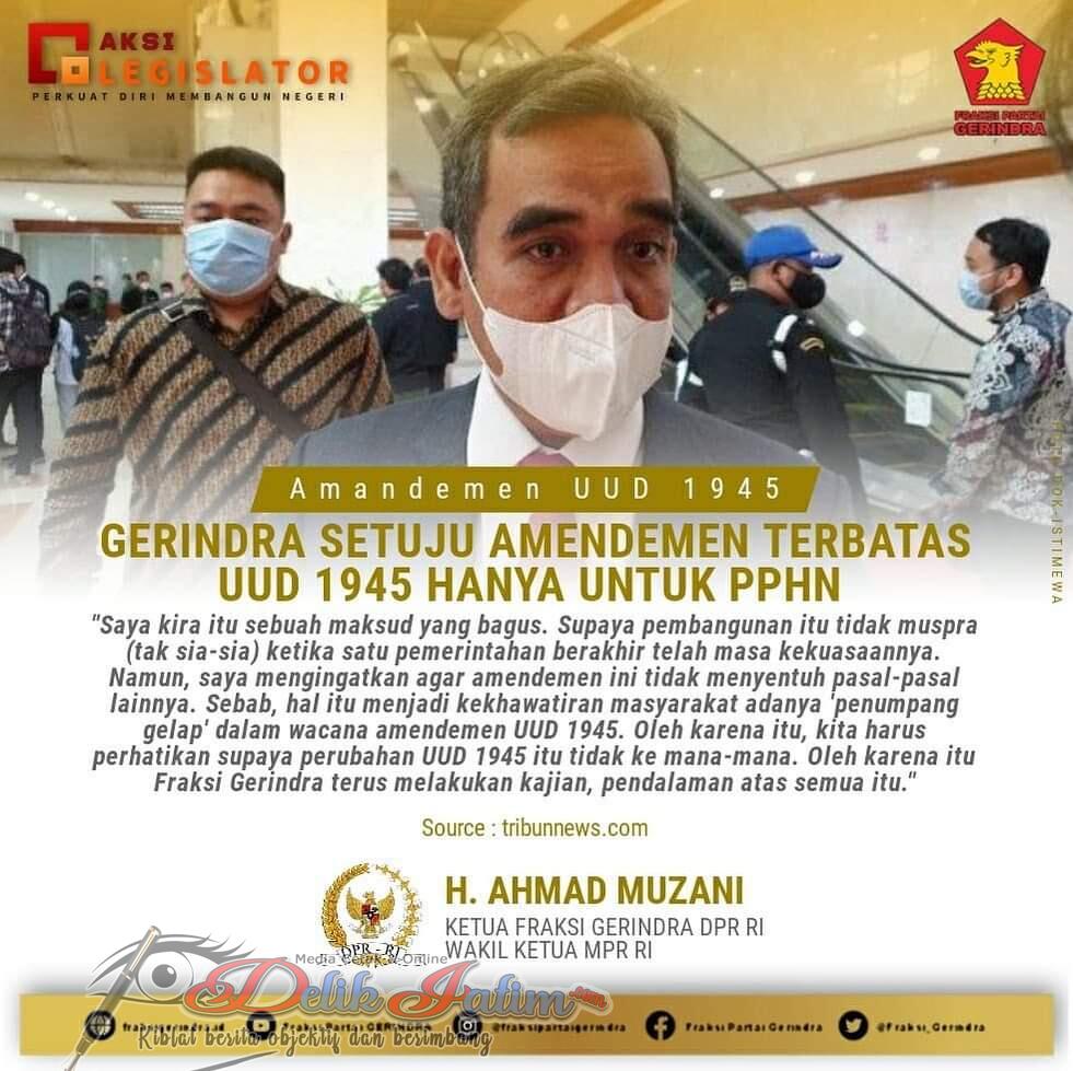 Jakarta, Delikjatim.com – Wakil Ketua MPR RI Fraksi Partai Gerindra Ahmad Muzani mendukung amendemen terbatas UUD 1945 hanya untuk memasukkan Pokok-Pokok Haluan Negara (PPHN).