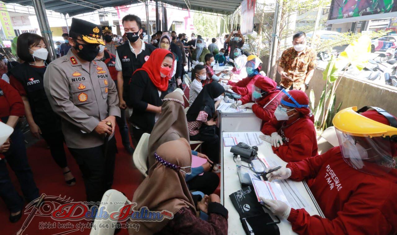 Surabaya, Delikjatim.com – Kapolda Jawa Timur Irjen Pol Nico Afinta, bersama Pejabat Utama Polda Jatim, Sabtu (28/8/2021) melakukan pengecekan serbuan vaksinasi Merdeka, yang berlangsung di Wage Sidoarjo dan Mapolres Mojokerto Kabupaten. Masing-masing menyiapkan sebanyak 1000 dosis baik tahap satu maupun tahap dua.