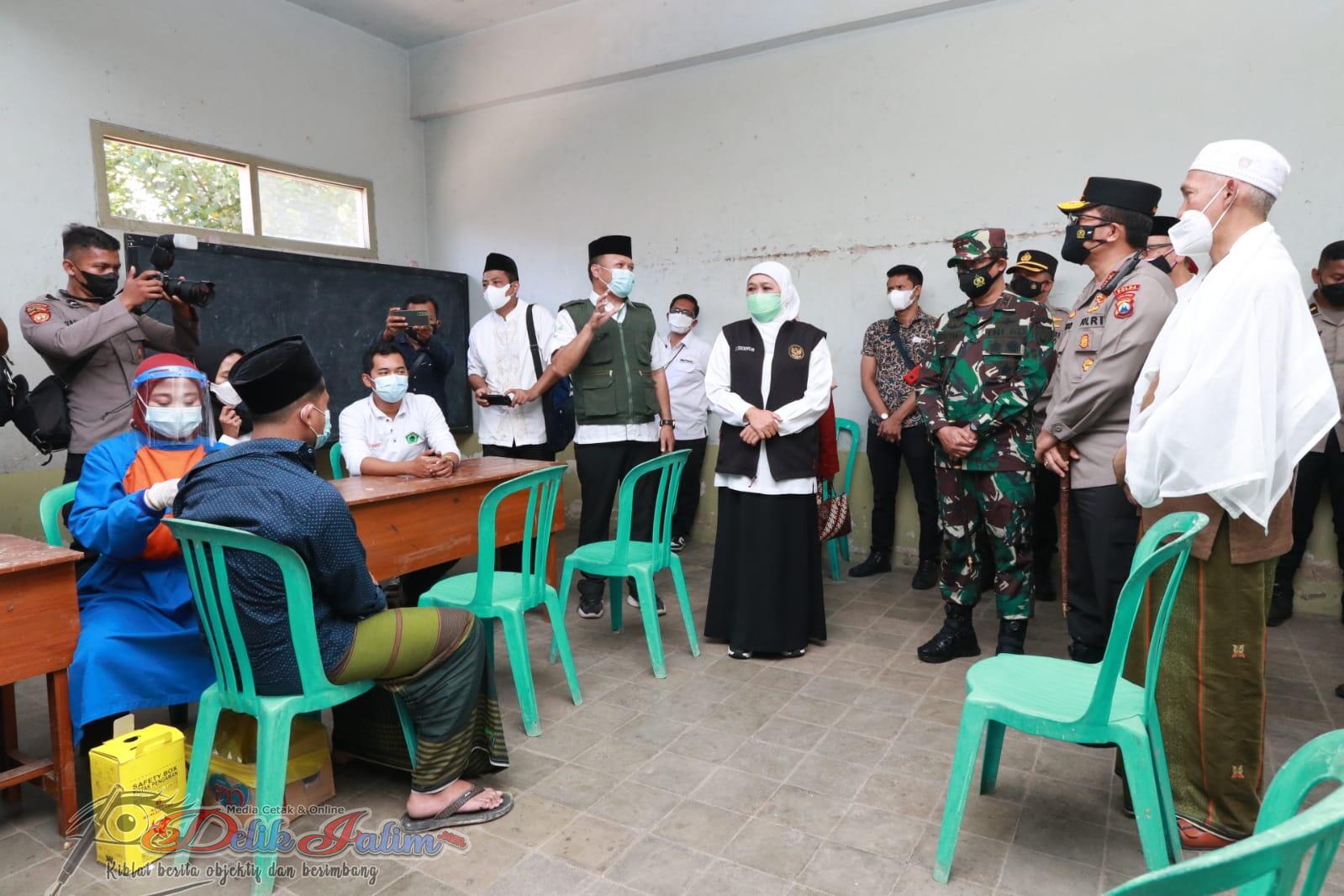 Dalam kunjungannya, Gubernur Jatim Khofifah mengatakan. Vaksinasi untuk santri pondok pesantren di Jatim dilakukan secara serentak. Saat ini total ada sebanyak 110 pesantren yang tengah dilakukan vaksinasi.