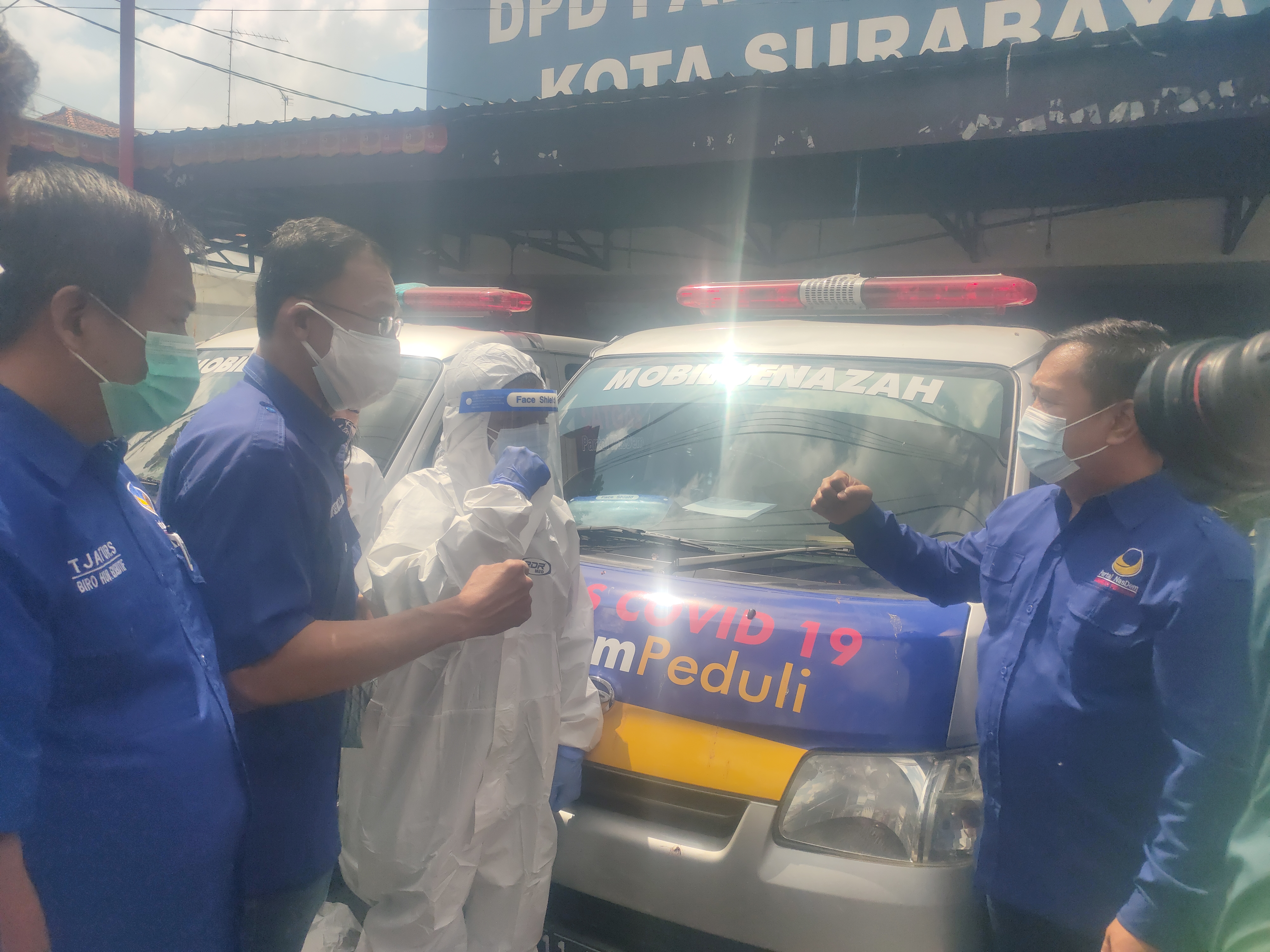 Bertempat di kantor DPD Nasdem Surabaya jalan Arjuno no 65 Surabaya Ketua DPD Nasdem Surabaya Robert Simangunsong memaparkan bahwa dua unit mobil ambulan ini diperuntukkan jenazah Covid-19.