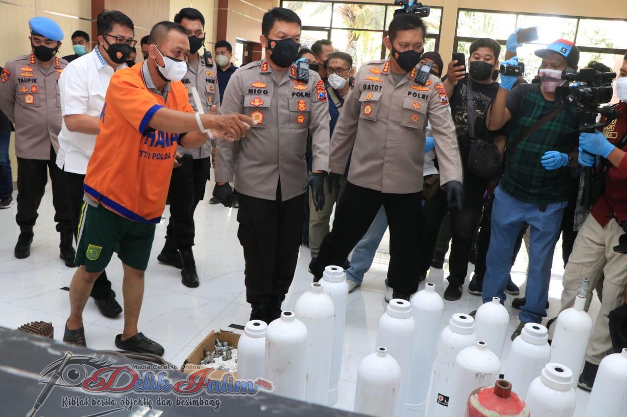 Kapolda Jawa Timur Irjen Pol Nico Afinta, didampingi Kabid Humas Polda Jatim dan Dirreskrimsus Polda Jatim, menjelaskan, Ditreskrimsus Polda Jatim berhasil mengungkap kasus mengedarkan atau menjual alat kesehatan tanpa izin edar, dengan modus operandi bahwa tabung apar di modifikasi yang kemudian menjadi tabung oksigen yang dijual kepada masyarakat seharga 4 juta.