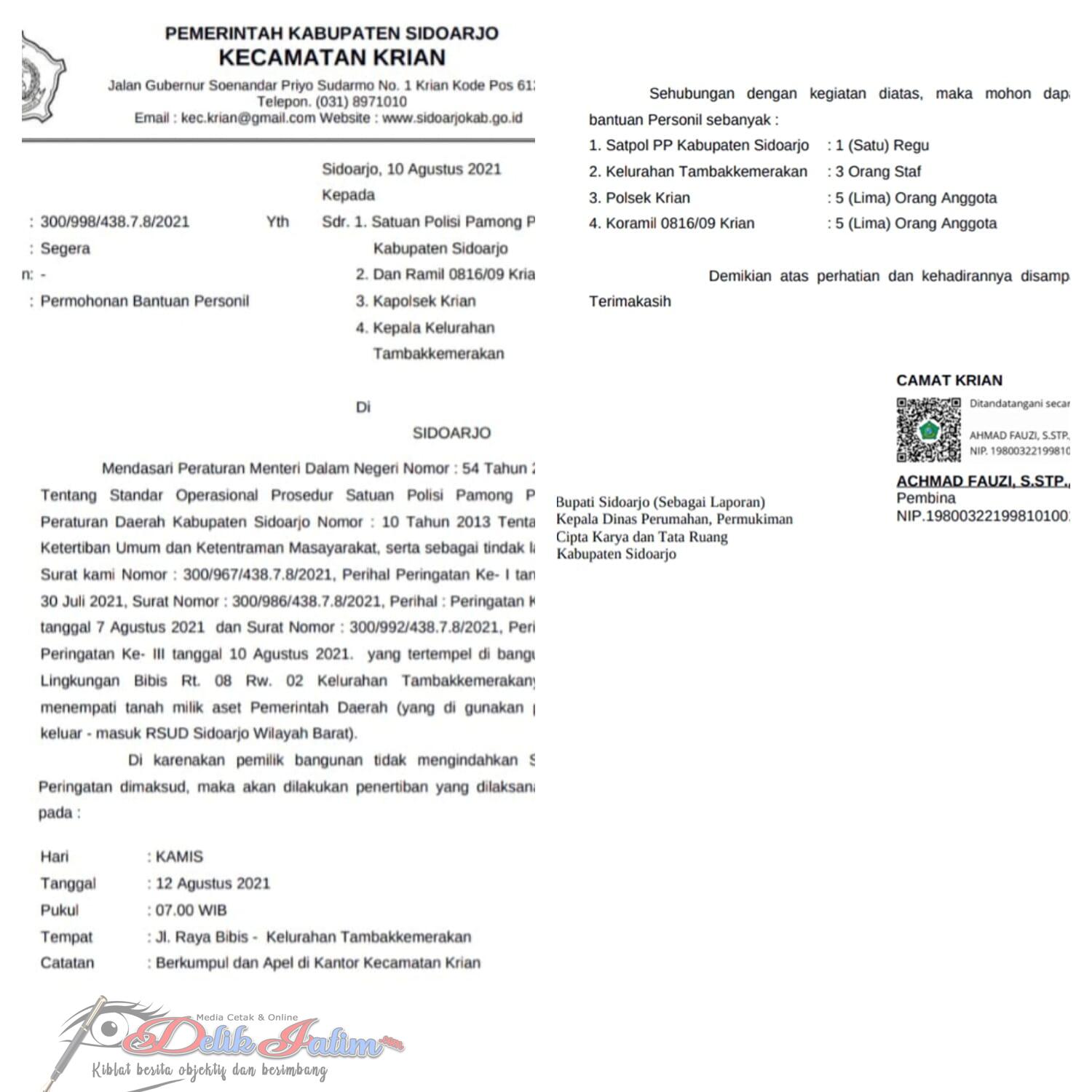 Sidoarjo, Delikjatim.com – Terkait adanya surat edaran dari Kecamatan Krian, yang rencananya pada tanggal 12 Agustus 2021 akan dilakukannya eksekusi lahan pemilik warung di jalan Bibis Bunder Kemerakan Kecamatan Krian Kabupaten Sidoarjo, dimana dalam surat edaran tersebut, pihak Kecamatan Krian telah meminta bantuan personil dari Satpol PP Kabupaten, Polsek Krian, Koramil, Staf Kecamatan serta dari Kelurahan Kemerakan.