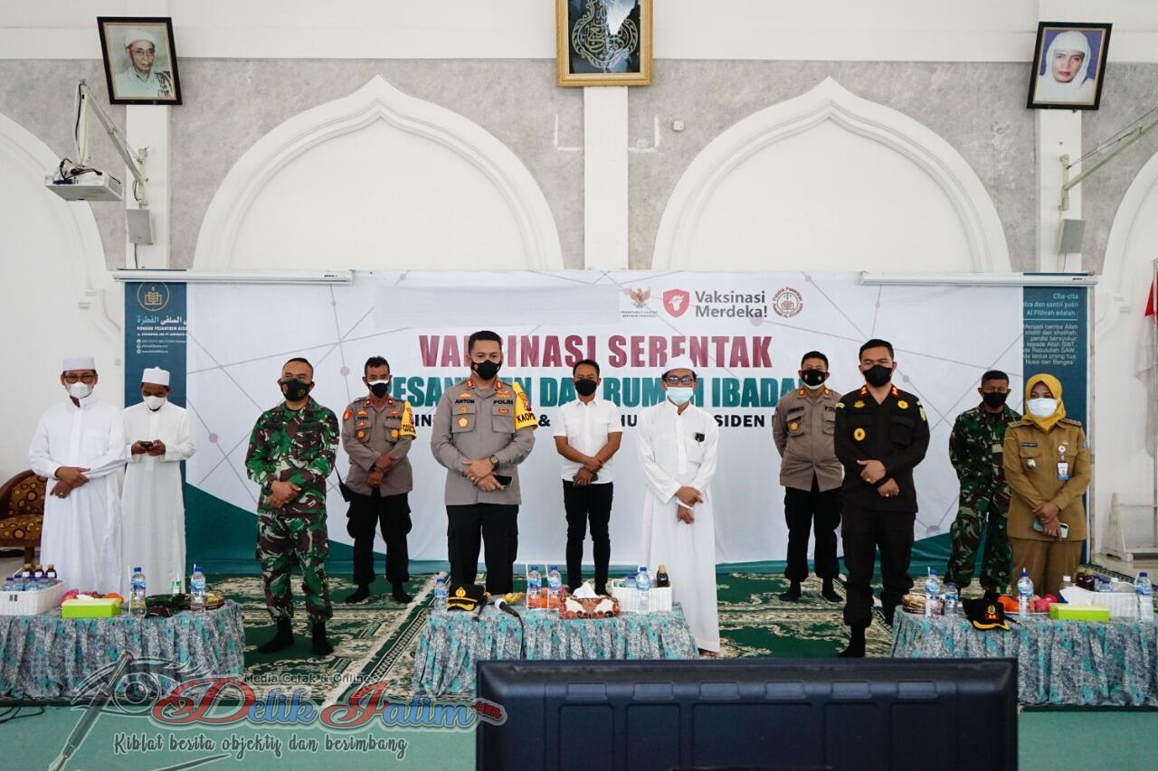 Kegiatan bertajuk ‘Vaksinasi Serentak Pesantren dan Rumah Ibadah Sinergi Polri & Staf Khusus Presiden RI’ ini juga terhubung secara virtual dengan Presiden Joko Widodo dan Kapolri.