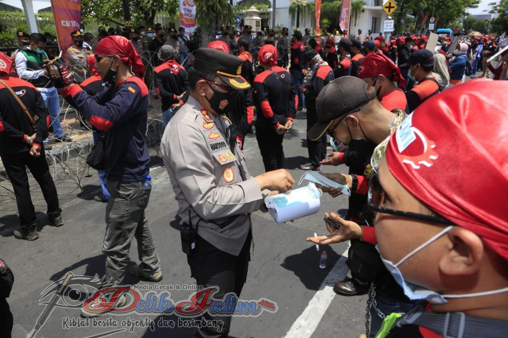 Sementara itu Doni Arianto korlap dari FSPMI mengucapkan terimakasih kepada Kapolreatabes Surabaya atas terselenggaranya Vaksin saat Unjuk rasa Damai tersebut.