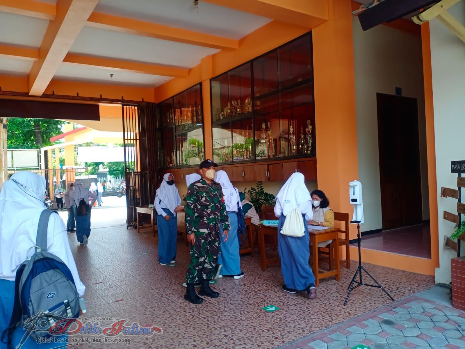 Surakarta, Delikjatim.com – Babinsa Kelurahan Danukusuman Serda S. Tito anggota Koramil 03 Serengan Kodim 0735 Surakarta didampingi Wakil Kepala SMKN 3 Surakarta Joko Pitono SPD mengecek Sekolahan yang melaksanakan Pembelajaran Tatap Muka (PTM) serta Sosialisasi Prokes, (08/11)