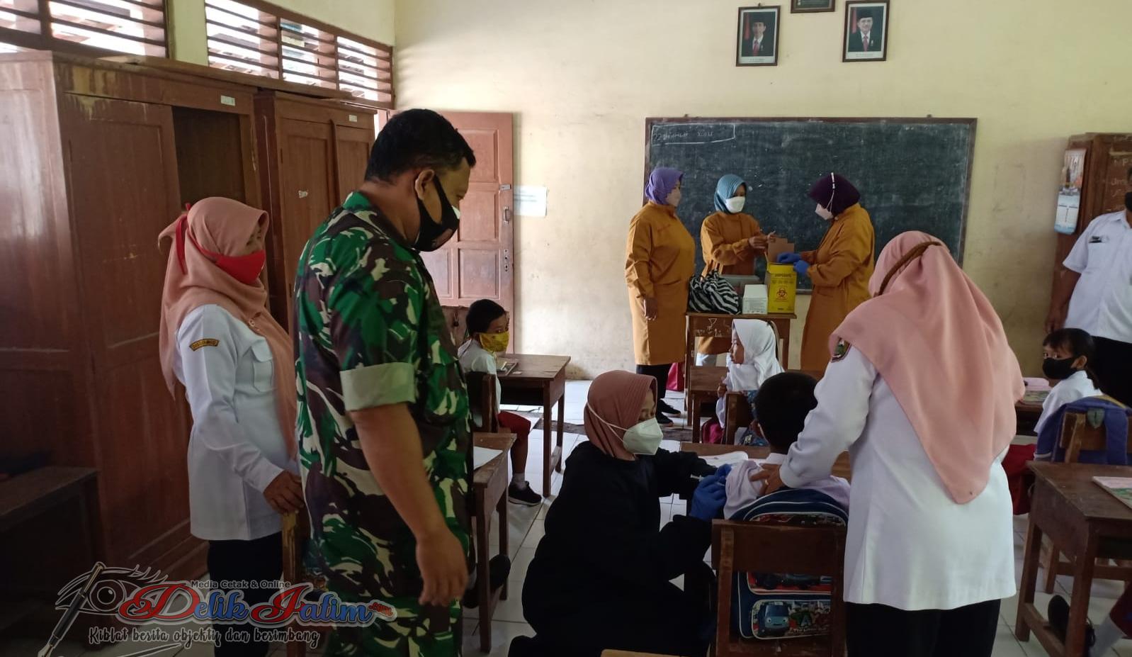 Boyolali, Delikjatim.com – Babinsa Jatisari Koramil 10/Sambi Kodim 0724/Boyolali Serka Sumadi melaksanakan monitoring dan pendampingan pelaksanaan jalannya Vaksinasi Covid – 19 jenis Sinovac dengan sasaran untuk anak usia 6 tahun sampai usia 11 tahun bertempat di tiga sekolah yaitu di SDN I Jatisari, SDN II Jatisari dan MI Jatisari Desa Jatisari Kecamatan Sambi Kabupaten Boyolali. Kamis (23/12/2021).