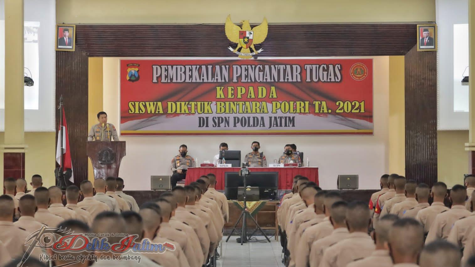 Kegiatan dilanjutkan dengan pembekalan pengantar tugas dan pemberian motivasi oleh Kapolda Jatim Irjen Pol Nico Afinta kepada Siswa Diktuk Bintara SPN Mojokerto Polda Jatim tahun 2021.
