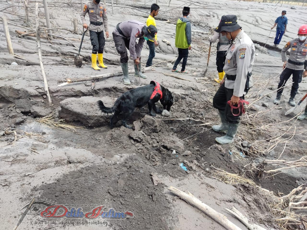 Surabaya, Delikjatim.com – Upaya Mabes Polri dan Polda Jatim mengerahkan 11 ekor anjing pelacak Unit Satwa K-9 dalam operasi pencarian korban guguran awan panas Gunung Semeru, akhirnya membuahkan hasil.