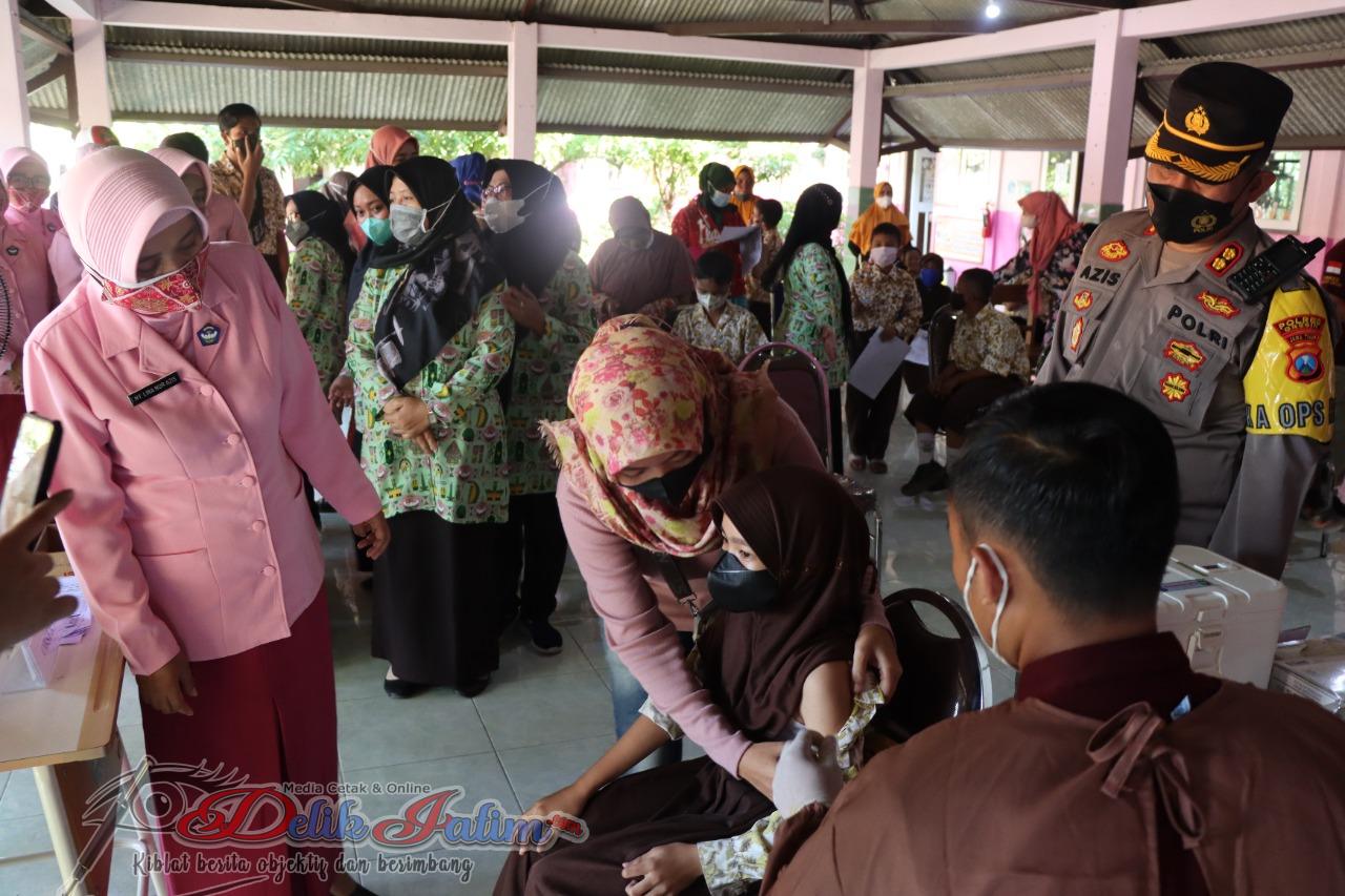 Gresik, Delikjatim.com – Polres Gresik menggelar vaksinasi murid berkebutuhan khusus di Sekolah Luar Biasa (SLB) Kemala Bhayangkari. Puluhan siswa menerima dosis vaksin didampingi Bhayangkari pada Kamis (23/12/2021).