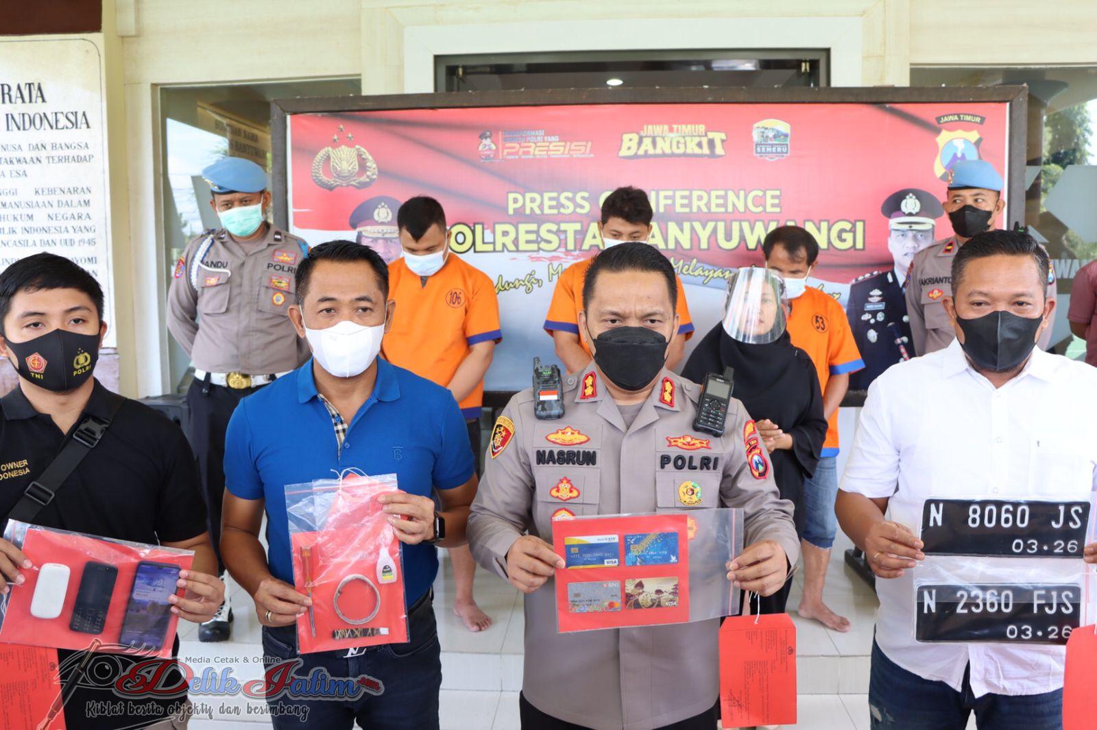 Banyuwangi, Delikjatim.com – Satuan Reserse Kriminal (Satreskrim) Polresta Banyuwangi berhasil mengamankan sindikat pelaku pencurian dengan modus ganjal mesin gerai ATM. Kapolresta Banyuwangi AKBP Nasrun Pasaribu menggelar konferensi pers Selasa (14/12) di Joglo Polresta Banyuwangi dengan didampingi Kasat Reskrim AKP Iwan Hari Kasi Humas Iptu Lita Kurniawan, KBO Reskrim Iptu Badrodin Hidayat, dan Kanit Resmob Iptu Ardhi Bitakumala.