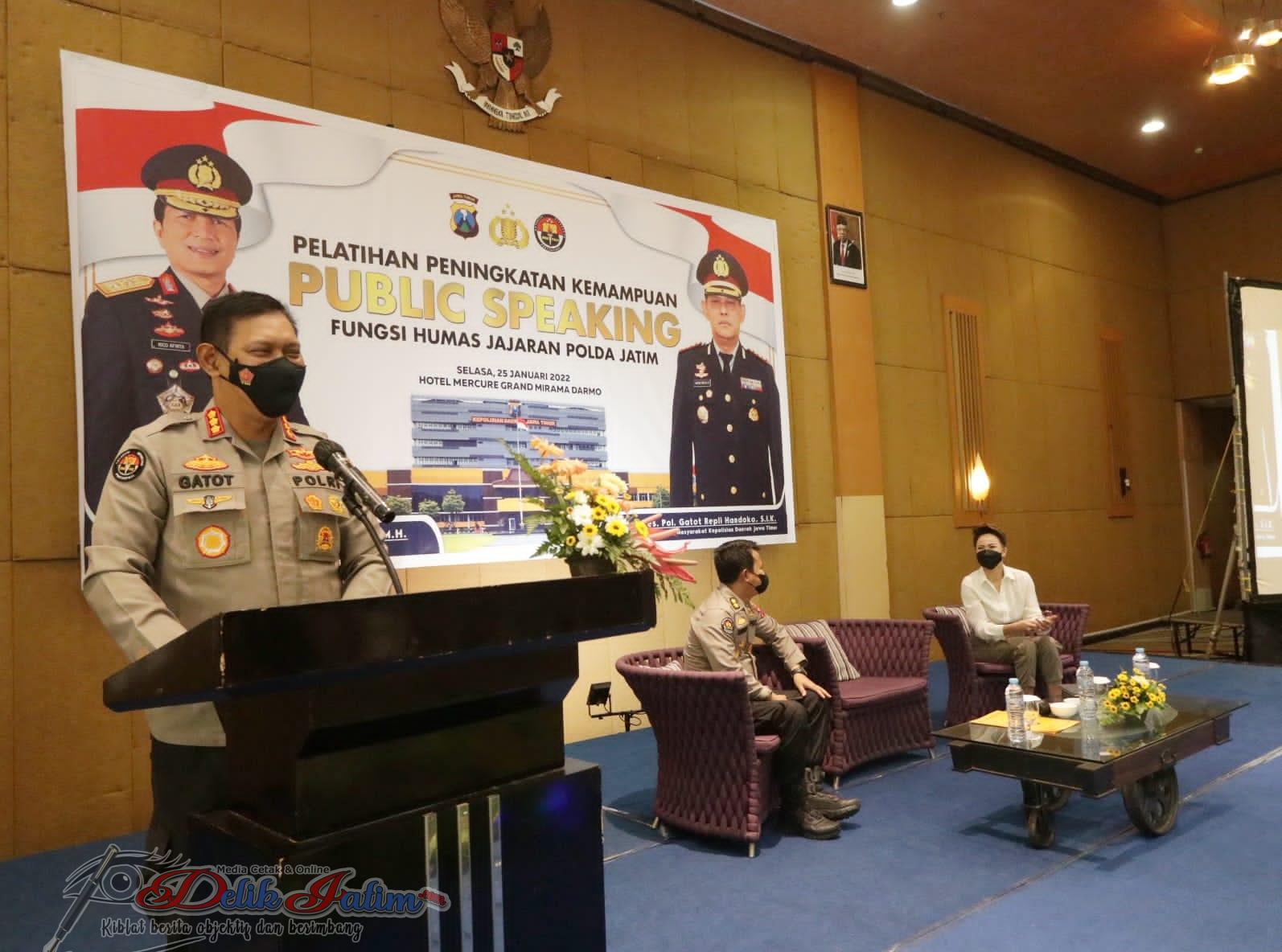 Surabaya, Delikjatim.com – Bidang Humas Polda Jatim menggelar Pelatihan Peningkatan Kemampuan Public Speaking Fungsi Humas Jajaran Polda Jatim di Ballroom Hotel Mercure Surabaya, pada Selasa (25/1/2022).