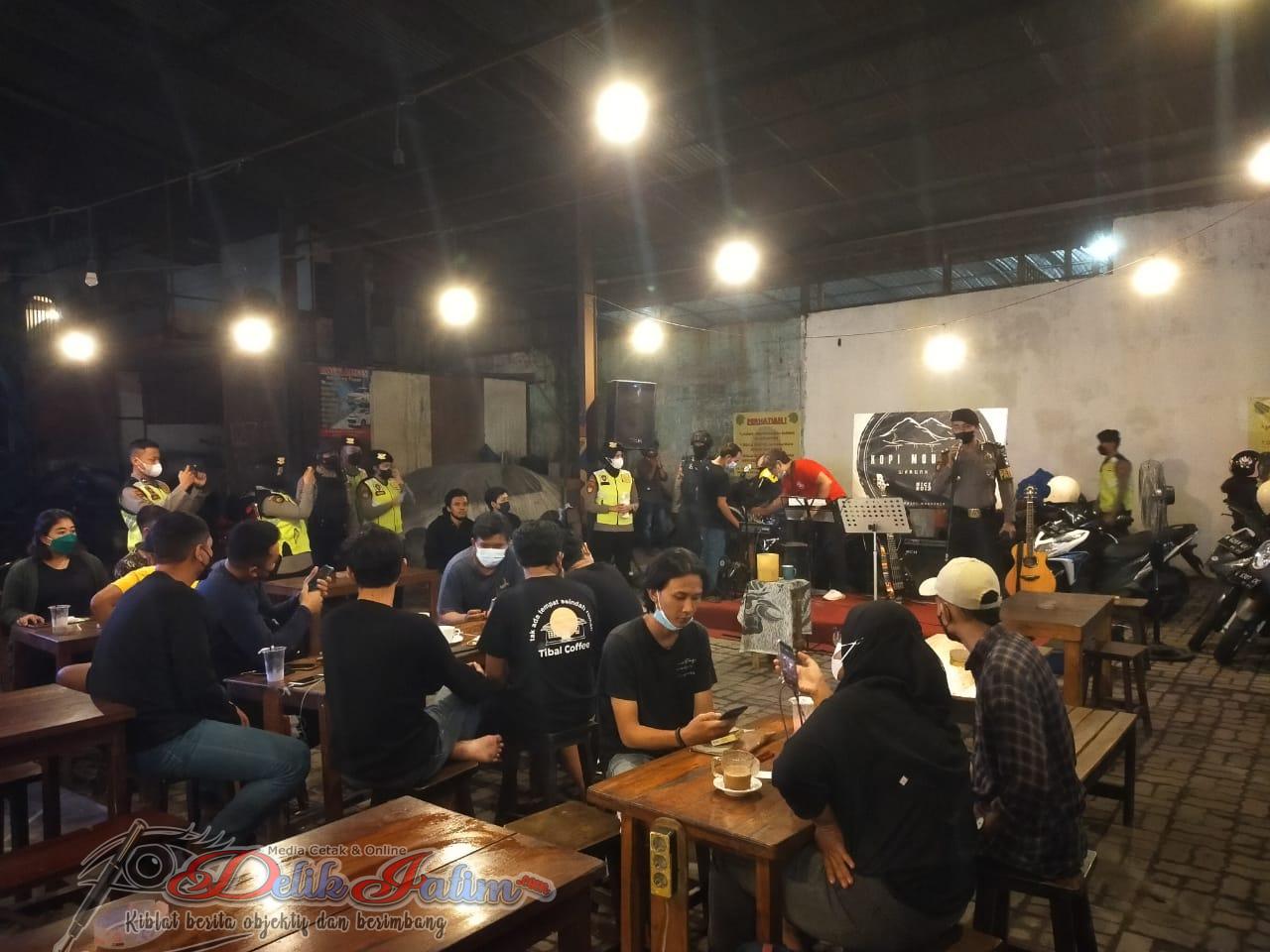 Surabaya, Delikjatim.com – Ditsamapta Polda Jatim melaksanakan giat Patroli Kegiatan Rutin Yang Ditingkatkan (KRYD) dalam rangka penegakkan protokol kesehatan di beberapa cafe dan warung kopi di Surabaya, pada Selasa (11/1/2022) malam.
