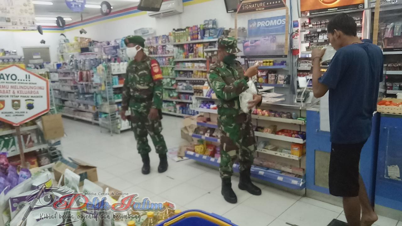Boyolali, Delikjatim.com – Dalam upaya mencegah penyebaran Covid-19 Koramil 19/Juwangi Kodim 0724/Boyolali melalui 2 orang Babinsanya Serda Sri Wahyono dan Serda Arif Sukoco serta Satpol-PP Kecamatan Juwangi melaksanakan kegiatan patroli yustisi di sekitar swalayan di Dukuh Ledok Rt 05 Rw 02 Desa Pilangrejo Kecamatan Juwangi Kabupaten Boyolali, Selasa Malam (11/01/2021).