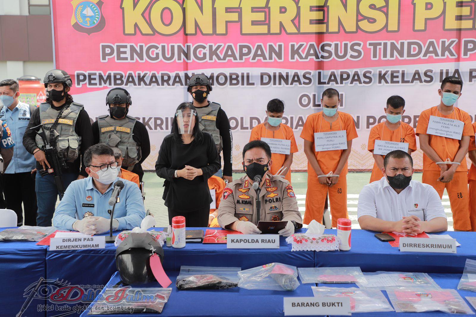 Konferensi pers berlangsung di Mapolda Riau dengan menghadirkan Kepala Kanwil Kemenkumham Riau, Kepala Divisi Pemasyarakatan Riau, Kepala Lapas Pekanbaru, dan jajaran Polda Riau. Seluruh pelaku kasus pembakaran dan barang bukti yang diamankan oleh Ditreskrimum Polda Riau juga turut dihadirkan dalam kesempatan ini. (Diyon).