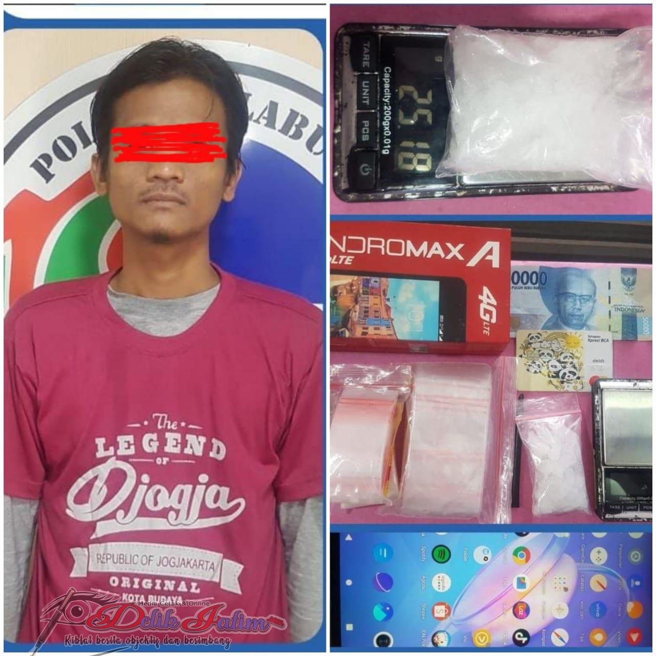 Tersangka diringkus oleh satres narkoba Polres Pelabuhan Tanjung Perak dengan kasus penyalahgunaan narkotika Golongan 1 jenis sabu-sabu di dalam rumahnya, Jumat 28 Januari 2022 sekira jam 08.00 Wib