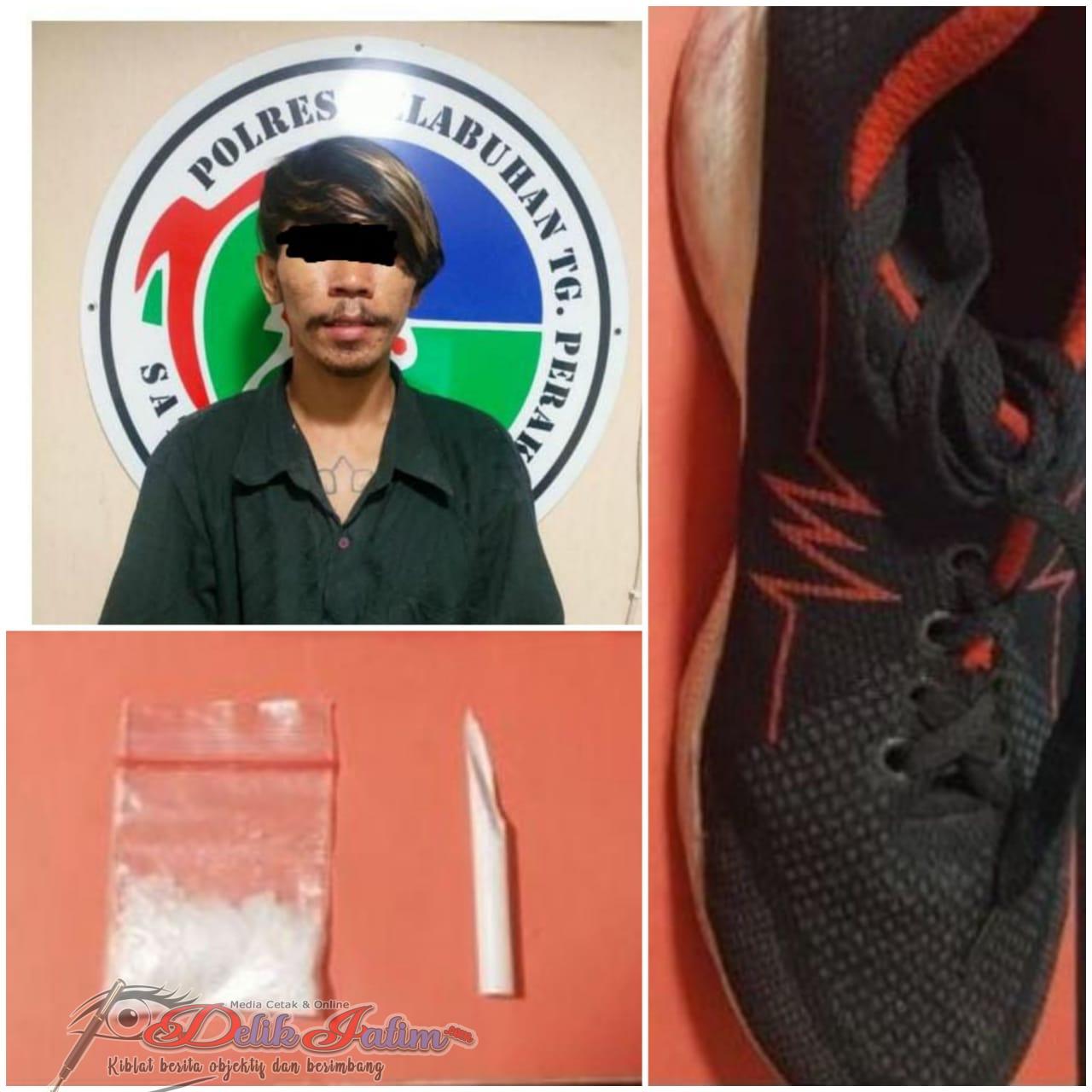 Adapun barang bukti yang diamankan yakni, 1 (satu) buah sepatu warna hitam, 1 (satu) buah klip plastik kecil yang didalamnya berisi narkotika jenis shabu dengan berat bruto + 2,20 (dua koma dua puluh) gram beserta dengan klip plastik pembungkusnya, 1 (satu) buah sekrop yang terbuat dari sedotan plastik warna putih.