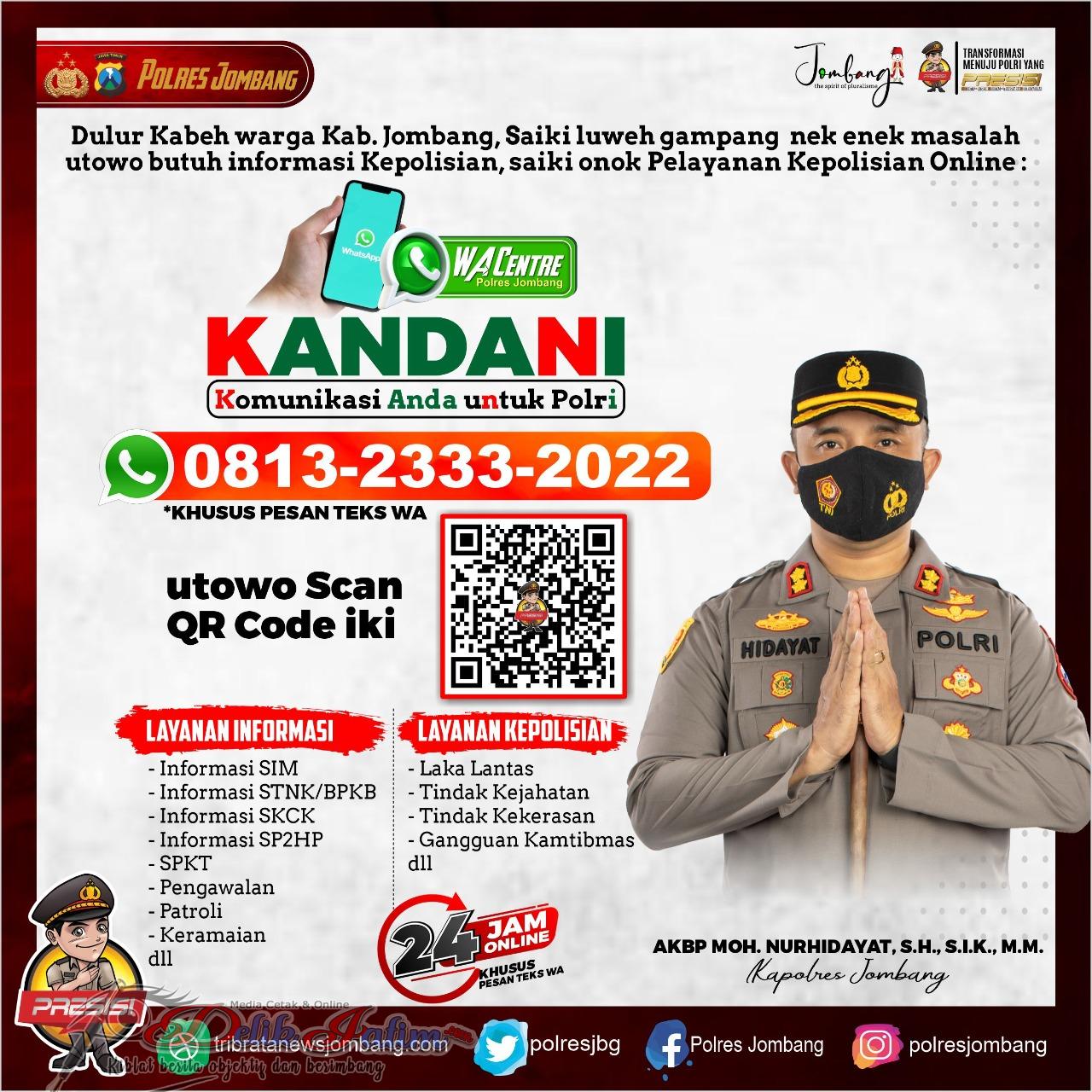 Kasi humas Polres Jombang Iptu Qoyyum Mahmudi mengatakan program layanan secara online itu diberi nama Kandani atau Komunikasi Anda untuk Polri. Masyarakat bisa menghubungi melalui pesan WhatsApp di nomor 081323332022 yang aktif 24 jam.