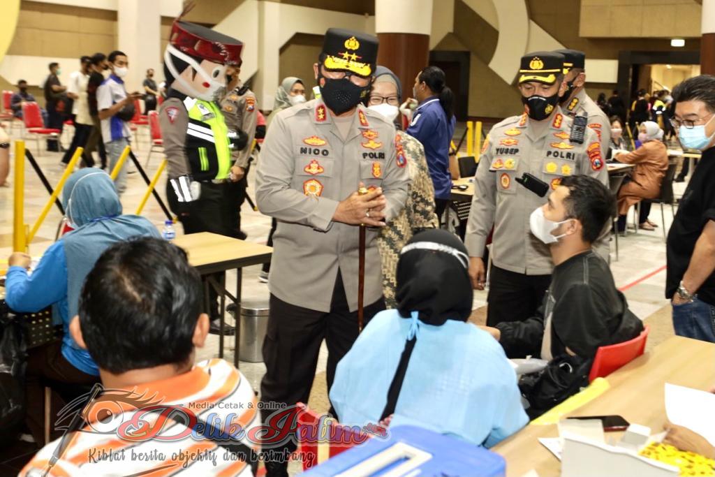 Surabaya, Delikjatim.com – Kapolda Jawa Timur Irjen Pol Nico Afinta bersama Kodam V/Brawijaya dan Forkopimda Provinsi serta Kota Surabaya, Kamis (3/2/2022) melakukan kegiatan vaksinasi massal di Tunjungan Plaza Surabaya. Kegiatan vaksinasi ini juga dilakukan secara serentak di Jawa Timur, dengan target 24.110 Dosis di 99 titik. Selain di jawa timur kegiatan vaksinasi massal juga dilakukan di beberapa lokasi di indonesia yang terhubung secara virtual dari lokasi vaksin di Depok Jawa Barat yang dihadiri oleh Menkes RI Budi Gunadi Sadikin, Kepala BNPB Letjen TNI Suharyanto, Kapolri Jenderal Listyo Sigit Prabowo serta Kasum TNI Letjen TNI Eko Margiyono.