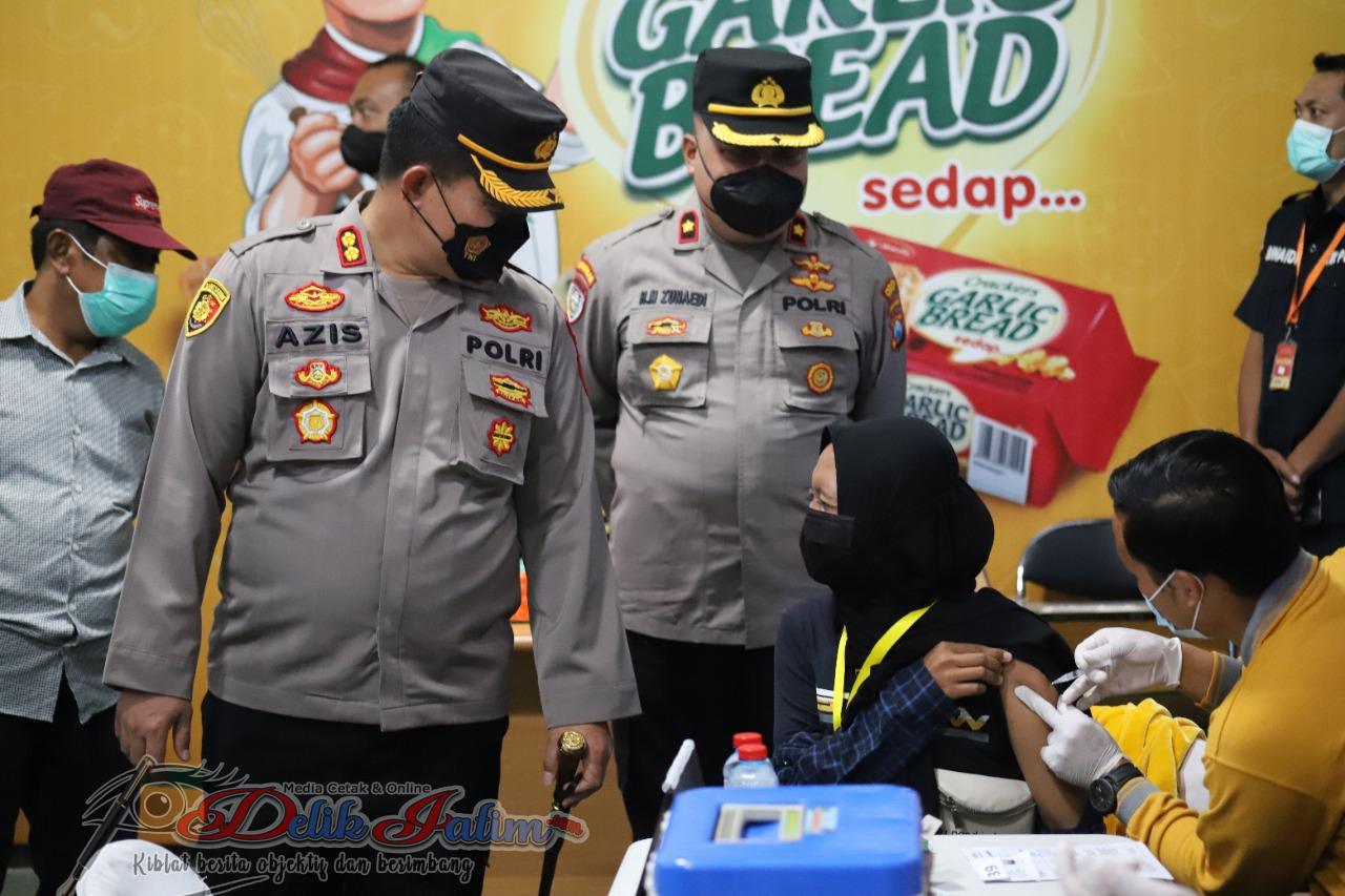 Gresik, Delikjatim.com – Kapolres AKBP Mochamad Nur Aziz bersama rombongan PJU(pejabat utama) didampingi Kapolsek Driyorejo Kompol H.M Junaedi dalam dalam rangka pelaksanaan giat vidcon vaksinasi secara serentak bertempat di PT. Mega Global Food Industri Desa Cangkir Kec.Driyorejo Kab.Gresik diikuti oleh 500 peserta.(26/02/22).