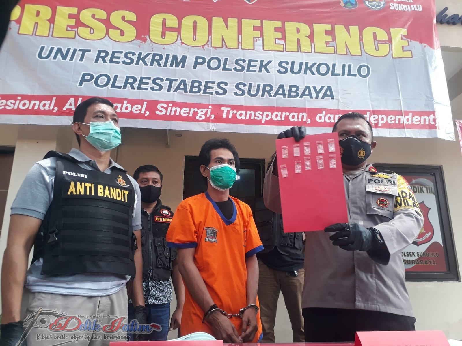 Kapolsek Sukolilo surabaya Kompol Muhammad Soleh .SH, MM yang didampingi Kanit Reskrim Ipda Selamet menjelaskan kepada awak media bahwa, Tersangka narkoba ditangkap oleh anggota Buser Polsek Sukolilo di Depan Rusun Sumbo Jl.Sumbo No.29 Kel.Simolawang Kec.Simokerto Kota Surabaya,