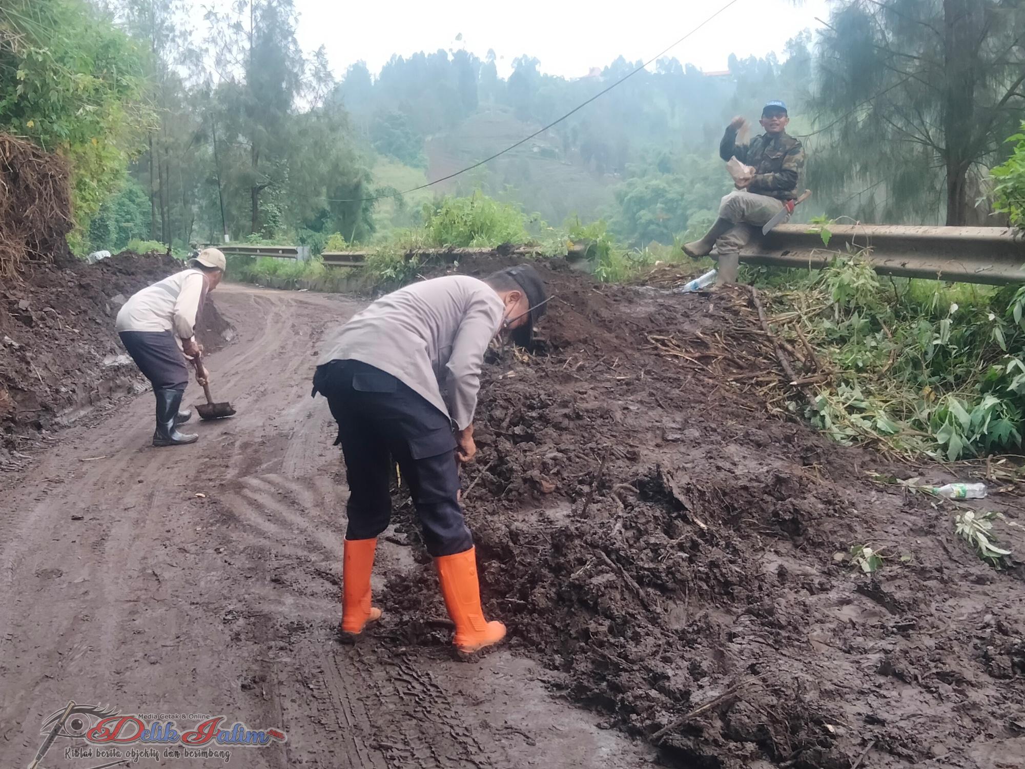 Sejumlah anggota Polres Probolinggo bersama Kodim 0820 Probolinggo menggelar kerja bakti dan melakukan pengaturan lalu lintas di lokasi longsor. Dibantu dengan mendatangkan alat berat dari Pemkab Probolinggo melakukan pembersihan material.
