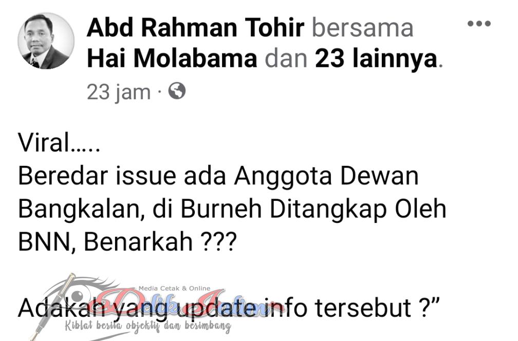 Terkait viralnya berita penangkapan oknum dewan tersebut diunggah oleh akun facebook Abd Rahman Tohir yang menandai 23 akun lainnya.