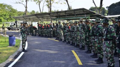 Danramil 03/Serengan Kapten Inf Narno selaku Komandan Latihan, memimpin pelaksanaan apel pengecekan terhadap personel pelaku dan penyelenggara sebagai bagian dari prosedur latihan.