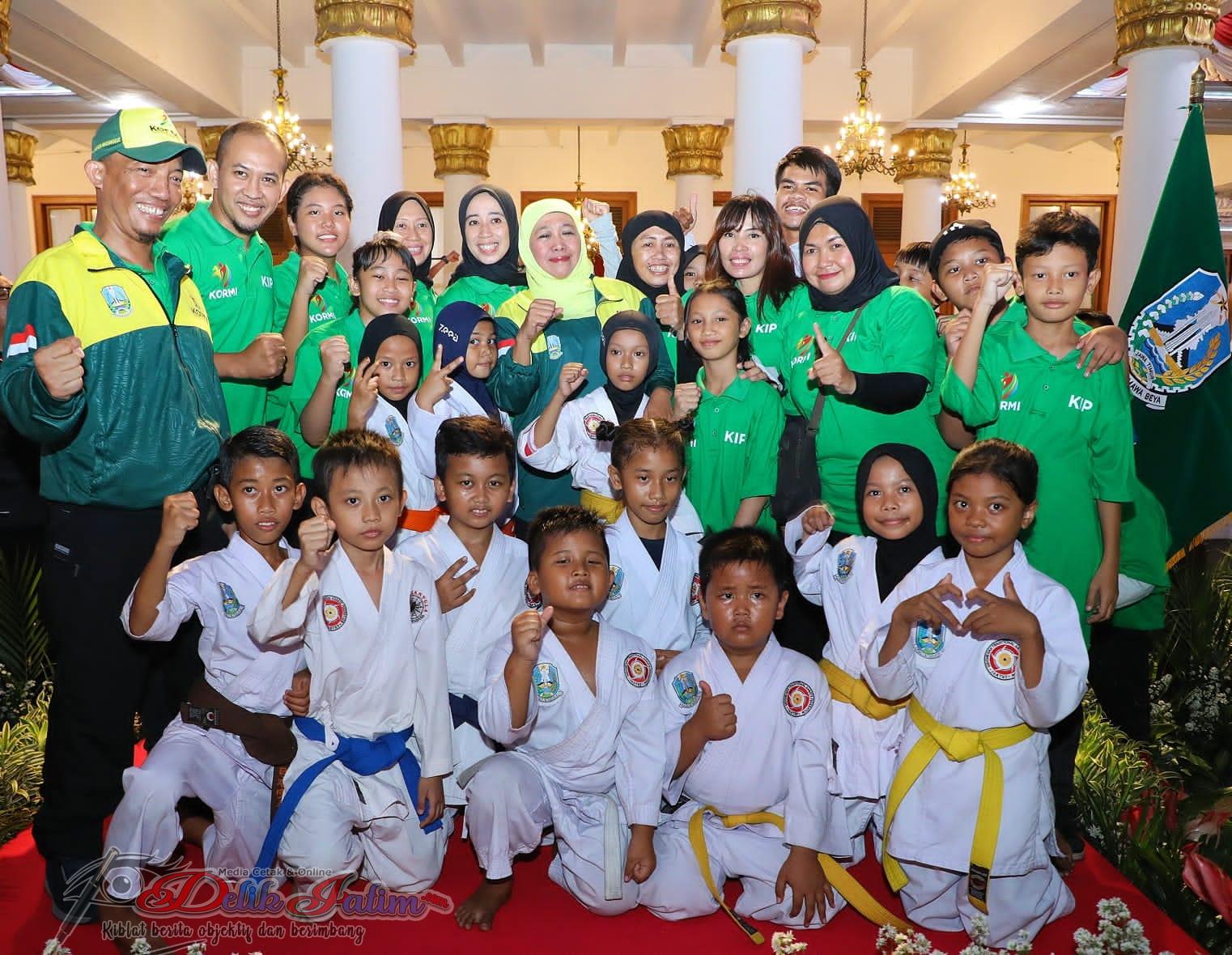 SURABAYA, Delikjatim.com – Gubernur Jawa Timur Khofifah Indar Parawansa melepas kontingen Komite Olahraga Rekreasi Masyarakat Indonesia (KORMI) Jatim yang akan berlaga di ajang Festival Olahraga Masyarakat Nasional (Fornas) VII di Bandung, Jawa Barat pada tanggal 2-3 Juli, di halaman Gedung Grahadi Surabaya, Jumat (30/6) sore.