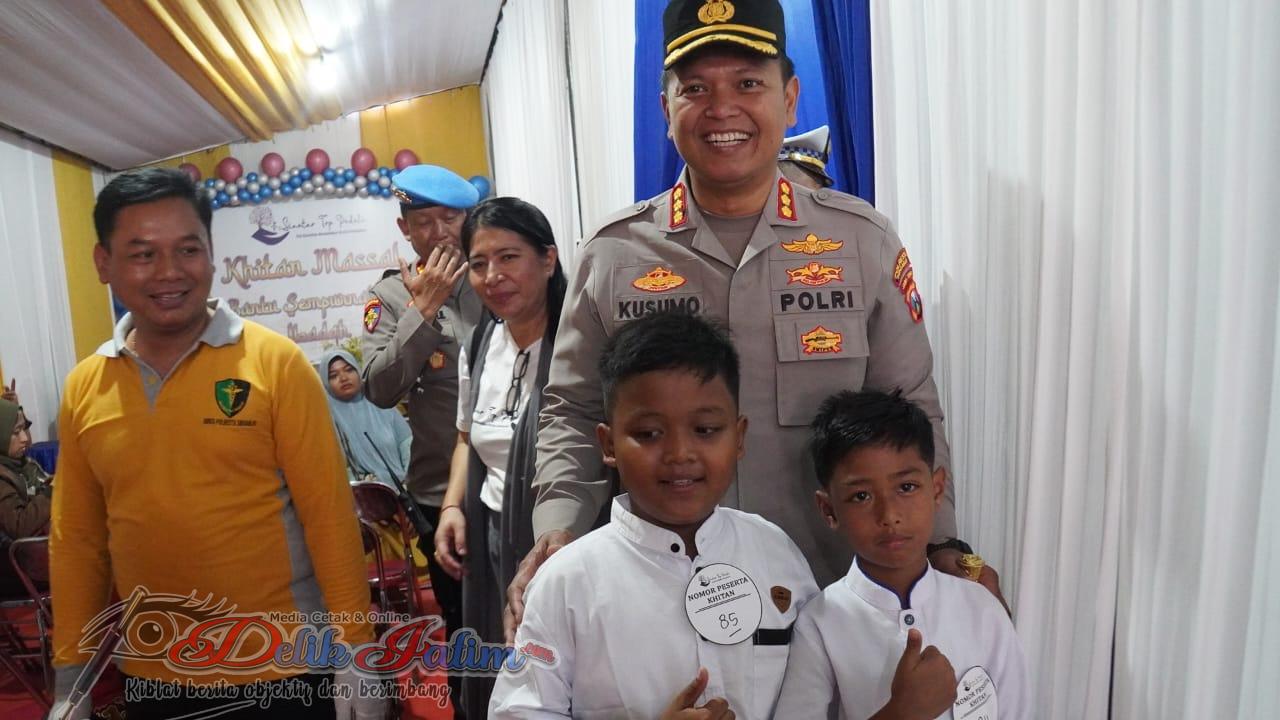 Kapolresta Sidoarjo Komisaris Besar Polisi Kusumo Wahyu Bintoro, hadir meninjau langsung pelaksanaan khitan massal ceria. Serta menyerahkan bingkisan kepada para peserta khitan.