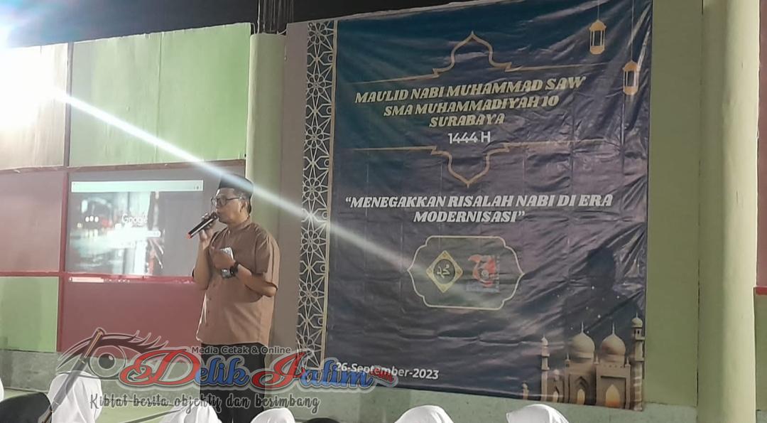 Surabaya, Delikjatim.com – Tim Ismuba Sekolah Keberbakatan Muhammadiyah Boarding Area Sport Art and Sains SMA Muhammadiyah 10 Surabaya lebih dikenal SMAMX menggelar kajian Maulid Nabi Muhammad SAW bertajuk “Menegakkan Risalah Nabi di Era Moderenisasi” yang diikuti 200 siswi dari kelas 10 hingga kelas 12, Selasa (26/9/2023).