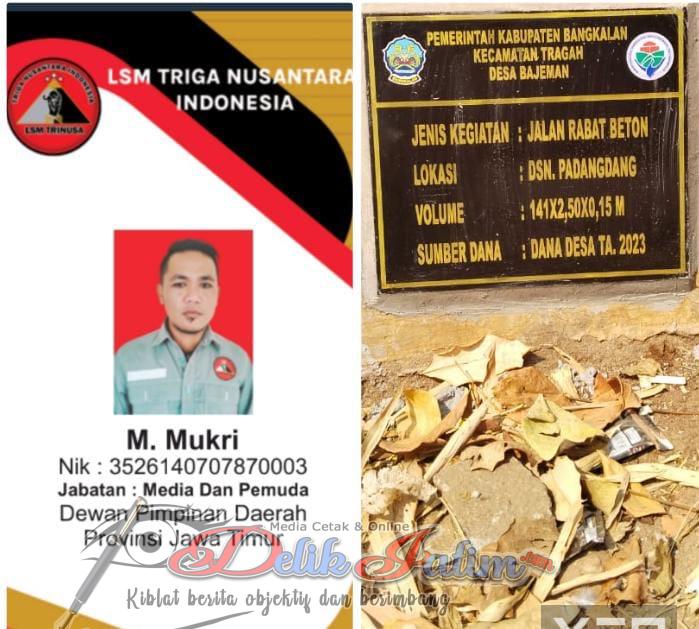 LSM- Triga Nusantara Indonesia M.mukri pemuda Japatan dewan pembina daerah provinsi Jawa Timur Klarifikasi menelusuri kebenarnya seperti apa kepada dua pihak ada mis komunikasi terkait adanya berita booming rabat beton yang ada di Dusun Padangdang Desa Bajeman kecamtan Tragah Kabupaten Bangkalan