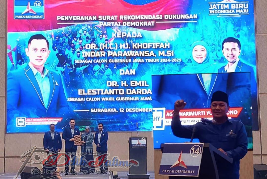Gubernur Jawa Timur Khofifah Indar Parawansa menyampaikan terima kasih atas rekomendasi yang diberikan Partai Demokrat kepada dirinya dan Emil Dardak. Rekomendasi tersebut menjadi modal penting untuk dirinya bisa kembali maju di Pilgub Jatim 2024.