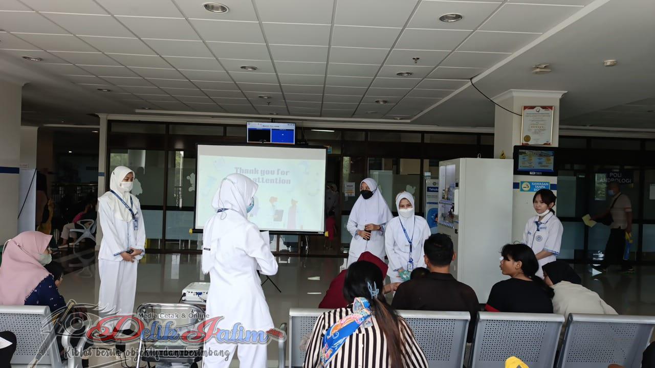 Kegiatan ini berlangsung di depan Poli Anak RS Unair Surabaya, dipandu langsung oleh bidan yang bertugas. Mereka memberikan penjelasan rinci tentang pentingnya pencegahan stunting sejak dini kepada para pasien yang sedang menunggu di ruang tunggu.