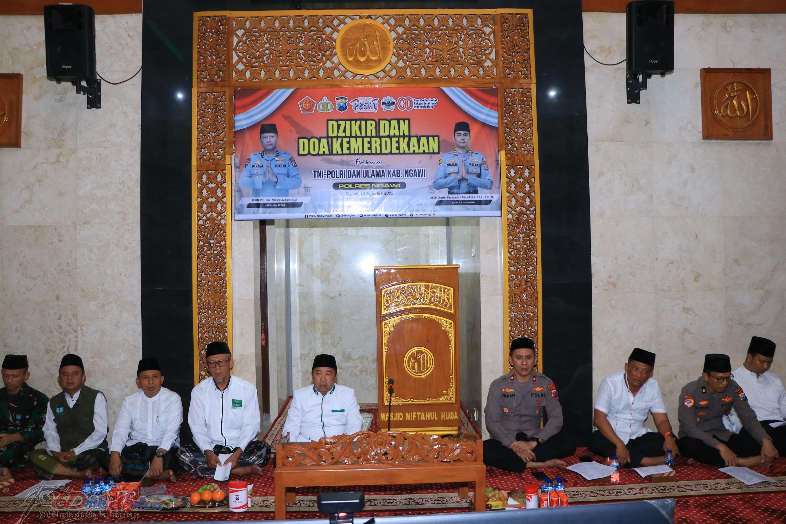 NGAWI, Delikjatim.com – Dalam rangka memperingati Hari Ulang Tahun ke-80 Kemerdekaan Republik Indonesia, Polres Ngawi Polda Jatim menggelar kegiatan Dzikir dan Doa Kemerdekaan di Masjid Miftahul Huda Polres Ngawi, pada Minggu malam (10/8/2025).