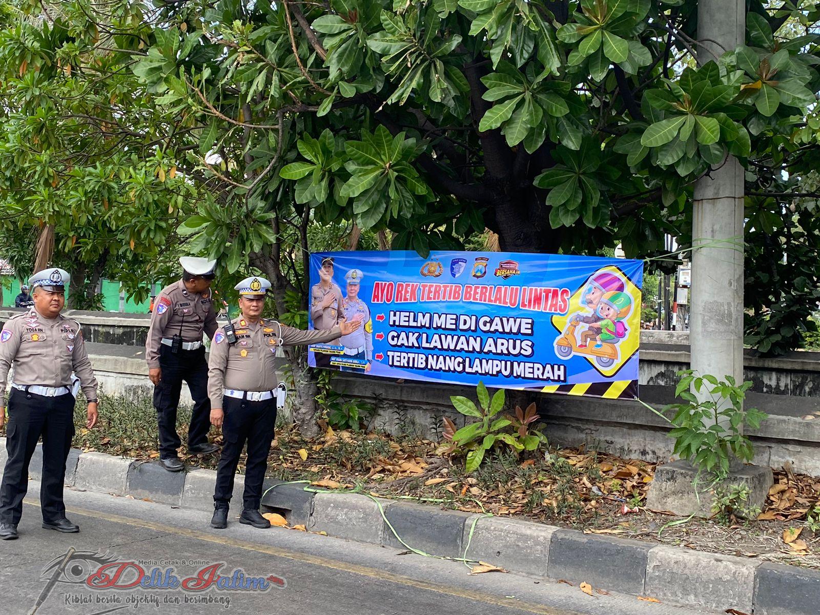Selain memberikan teguran simpatik, petugas juga memasang spanduk berukuran besar di titik strategis. Spanduk tersebut menggunakan bahasa yang khas dan mudah dipahami masyarakat Surabaya, bertuliskan “Ayo Rek Tertib Berlalulintas, Helem me Digawe, Gak Lawan Arus, Tertib Nang Lampu Merah.”