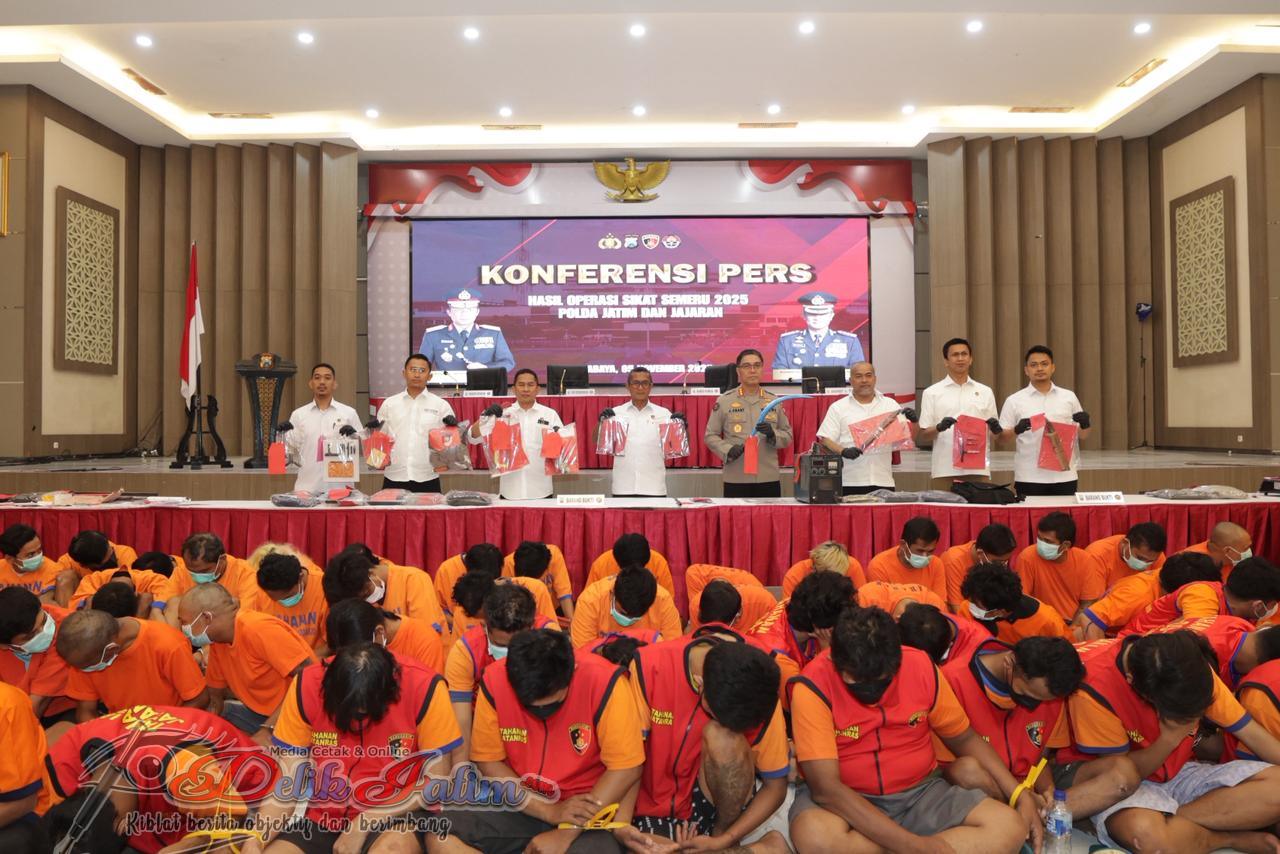 SURABAYA, Delikjatim.com – Kepolisian Daerah Jawa Timur (Polda Jatim) berhasil mengungkap 1.443 kasus kejahatan dengan 1.135 tersangka selama pelaksanaan Operasi Sikat Semeru 2025 yang digelar selama 12 hari, mulai 22 Oktober hingga 2 November 2025.