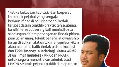 Surabaya, Delikjatim.com – Direktur APMP Jatim (Aliansi Pemuda dan Mahasiswa Peduli Jawa Timur), Acek Kusuma menyoroti tajam dengan maraknya korupsi dan TPPU (Tindak Pidana Pencucian Uang) yang terjadi di Indonesia khususnya Provinsi Jawa Timur.